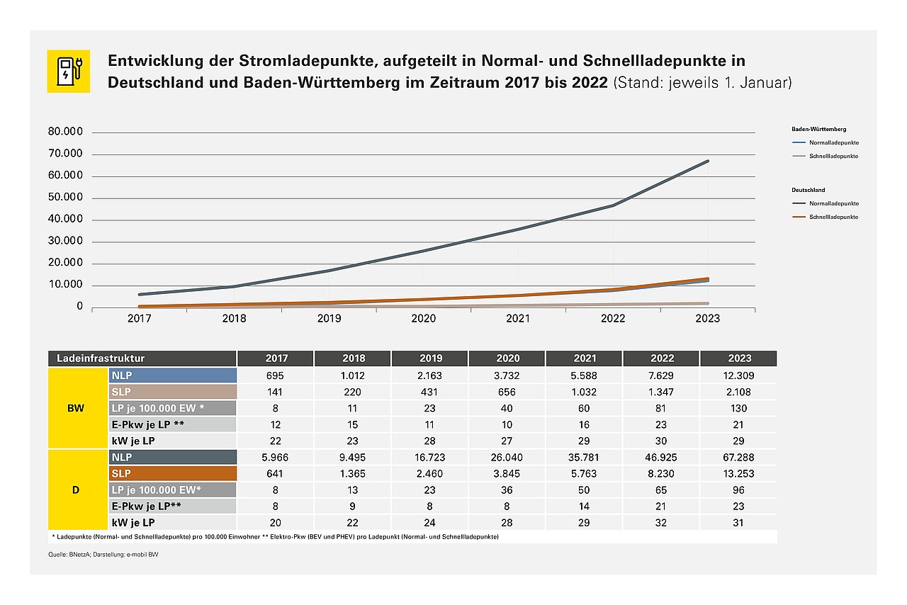 Baden-Württemberg verfügt zum 1. August 2025 über 29.946 öffentlich zugängliche Ladepunkte, davon 24.797 Normalladepunkte (NLP) und 5.149 Schnellladepunkte (SLP). Der Anteil der Schnellladepunkte am Gesamtbestand liegt bei 17 % (Deutschland: 24 %). Die gesamte installierte Ladeleistung beträgt 977.301 kW; die durchschnittliche Leistung je Ladepunkt liegt bei 33 kW (Deutschland: 41 kW).