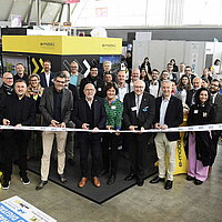 Die Themenwelt "Mobilität nachhaltig und digital" der i-Mobility 2023 wird feierlich eröffnet. Der baden-württembergische Verkehrsminister, Winfried Hermann (Mitte), zerschneidet das Eröffnungsband auf dem Messestand der Landesagentur e-mobil BW.
