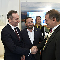 Anschließend an das Top-Level-Meeting begrüßt e-mobil BW Geschäftsführer Franz Loogen (rechts) Dr. Volker Wissing (links), Bundesminister für Verkehr und digitale Infrastruktur, beim Rundgang über die Ausstellung.